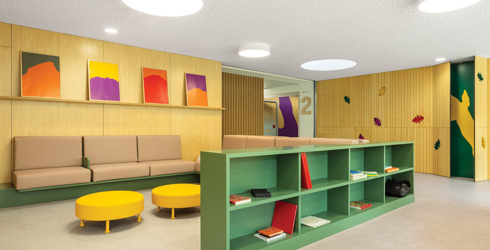 For the hospital’s Pediatric Cancer Center Barcelona, housed in a new building by architecture firm Pinearq, the collaborating designers sought to continue their ongoing tribute to what Pinto calls “extraordinary nature” throughout the 71,000-square-foot, three-floor facility. They had already introduced “an enormous number of animals in the hospital” in previous projects, Rubio notes. An octopus, which typically has three hearts, is a kind of mascot in the cardiology unit. And more than 100 other 2-D and 3-D creatures, including lacquered-plywood tigers and adhesive-vinyl jellyfish, watch over the ER department in an installation that won a 2014 Interior Design Best of Year Award in the healthcare category.