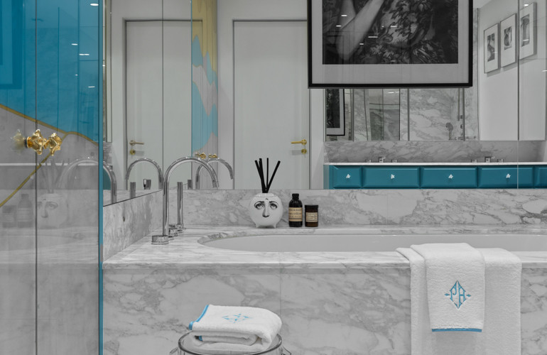 For Polina Askeri, a gallery owner and social media influencer in Moscow, there is no one better than her own sister to design an apartment that matches her taste. “She really likes quirky objects and unusual pieces,” shares Angelina Askeri, founder and principal of her namesake interior design firm. Drawing inspiration from the many shades of blue in the sea and Jean-Michel Frank’s apartment for Nelson Rockefeller, Angelina combined Polina Askeri’s love for both the simplicity of nature and the extravagance of art for a one-of-a-kind home.