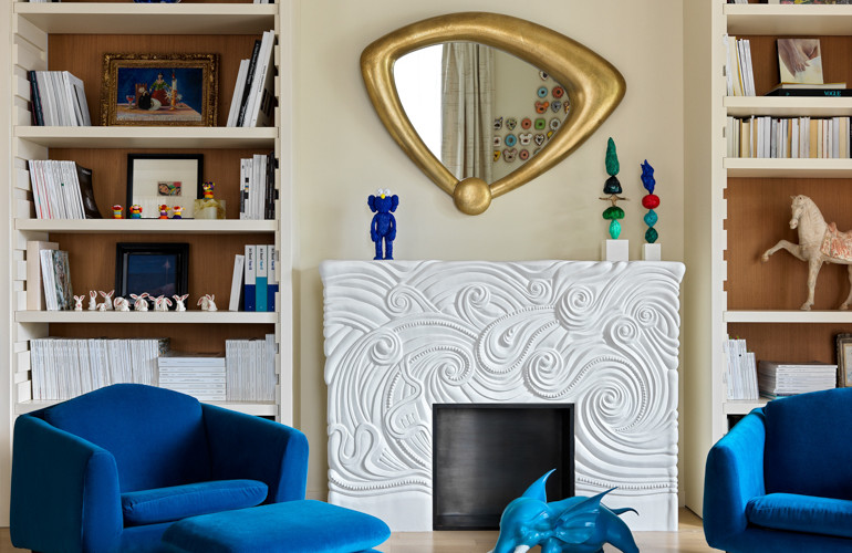 With a background in fine arts, Angelina Askeri sketched the designs for pieces she could not otherwise find to match her sister’s specific vision. The living room’s focal point, a non-functioning fireplace with a TV that emerges from the top, reflects the dynamism of the ocean’s waves with a paisley-like design set in plaster, Angelina Askeri first drew up. Overall, art is central to this project; from displaying the sketches of Marc Chagall and Yayoi Kusama, sculptures by Jeff Koons and KAWS, and bringing her own drawings to life, Angelina Askeri created a space that reflects her sister's artful life.
