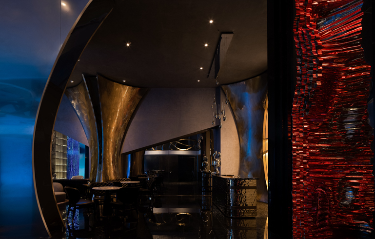 At the entrance, visitors are enveloped by a canyon-like passageway crafted from stainless steel, one of many installations that reference the five elements of Chinese culture—gold, wood, water, fire, and earth. “We approached the spatial narrative in a manner such that it pays tribute to nature and creating immersive experiences,” says Wang Zhike, one of the project’s co-leads, along with Li Xiaoshui. The design highlights the unique forging process of metal, presenting different interpretations of the free-flowing state of iron ore when melted at high heat.
